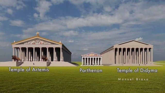 An approximate comparison between the Temple of Artemis, the Parthenon in Greece and the Temple of Didyma in modern-day Turkey.
