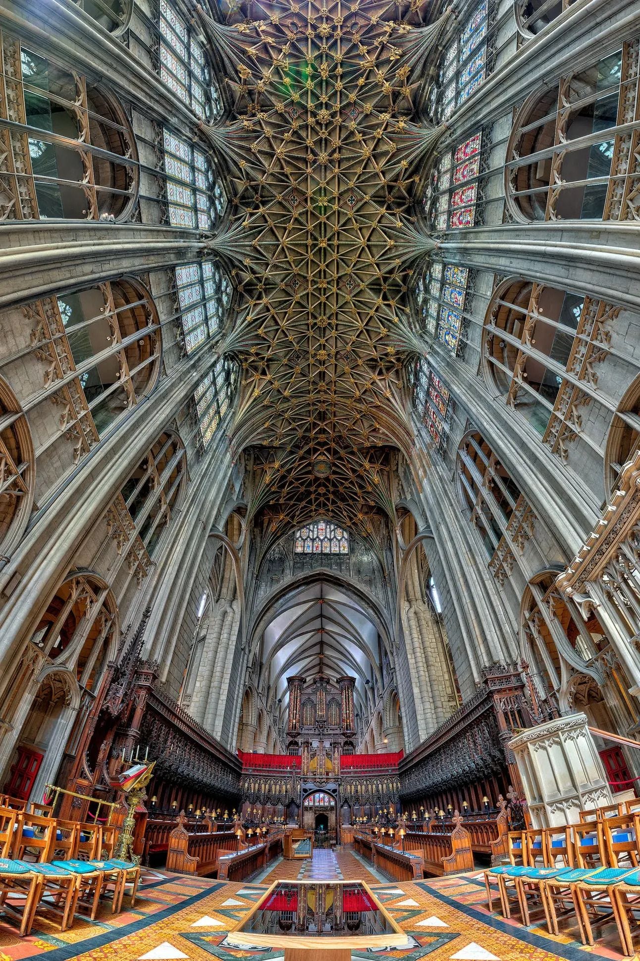 In England, it turned “perpendicular.” Walls became towering windows, vertical lines ruled the eye, and fan vaults bloomed overhead.