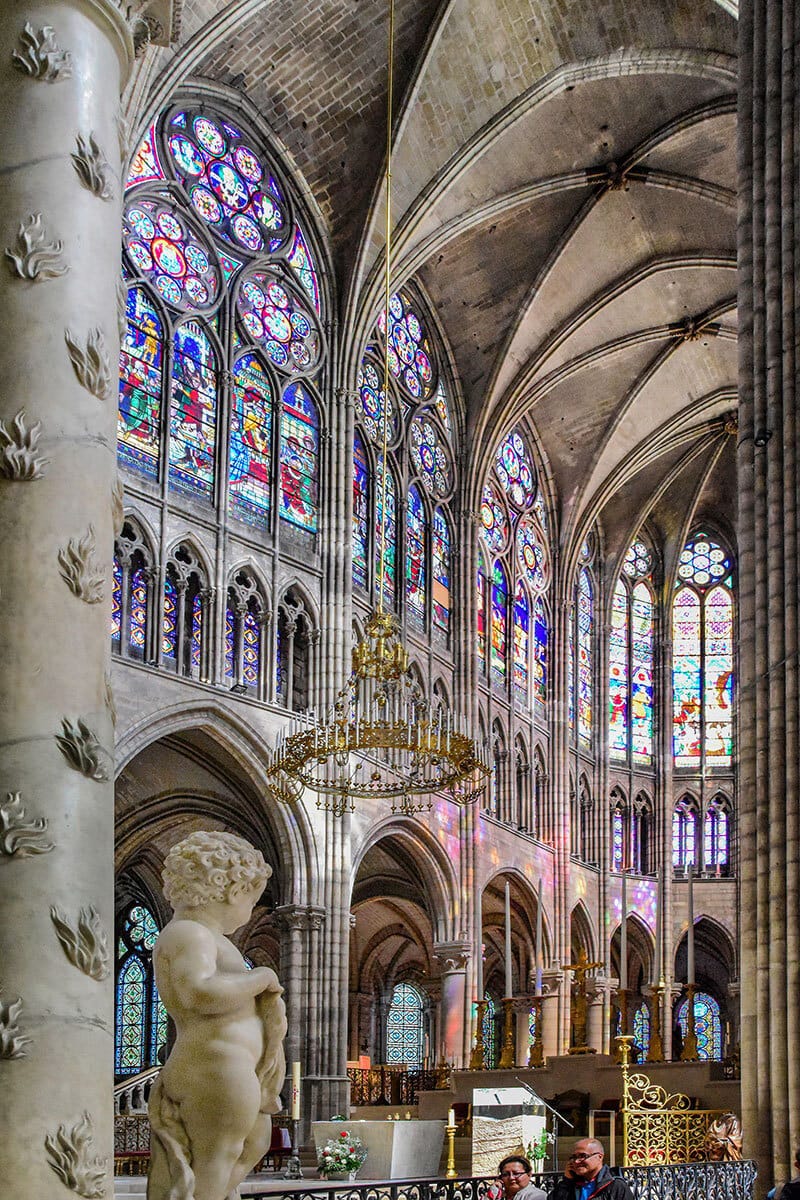 He introduced pointed arches, which channeled weight more efficiently than round ones. Ribbed vaults, which lightened the ceiling and allowed greater height, and large stained-glass windows, which flooded the interior with light. He managed to create a building that was huge in comparison to older cathedrals, yet it was brighter and seemed more alive.