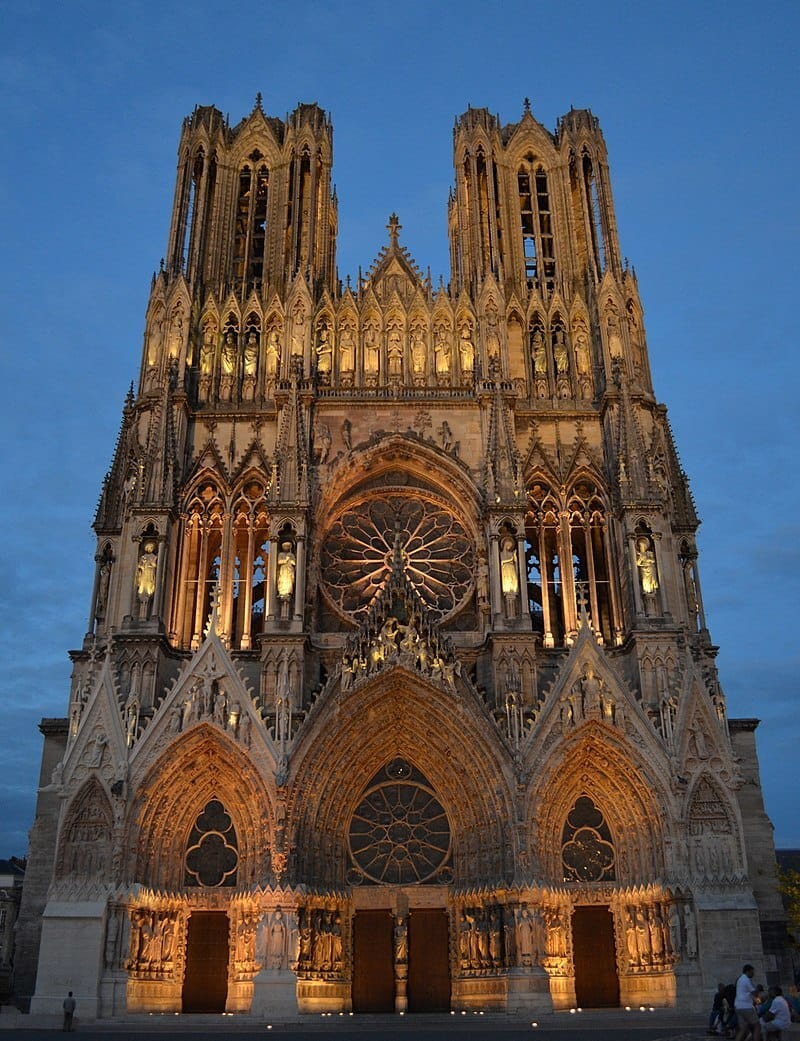 Reims Cathedral was completed in the 14th century. The current cathedral was built to replace an earlier church that burned down in 1210.